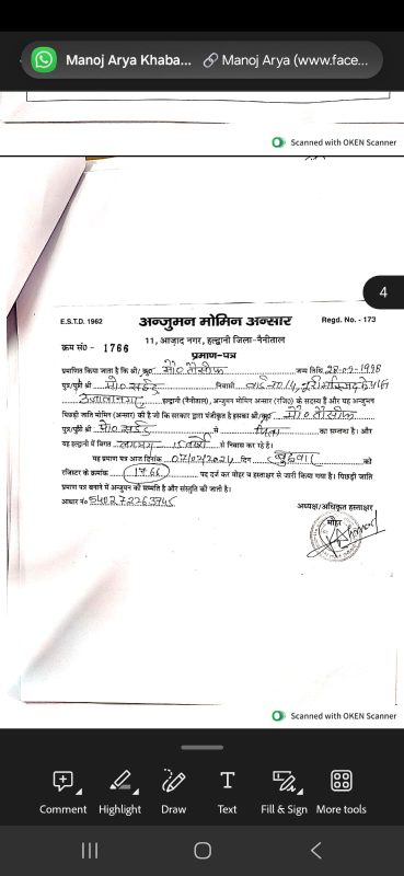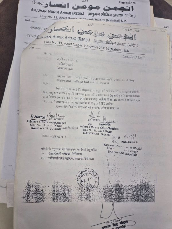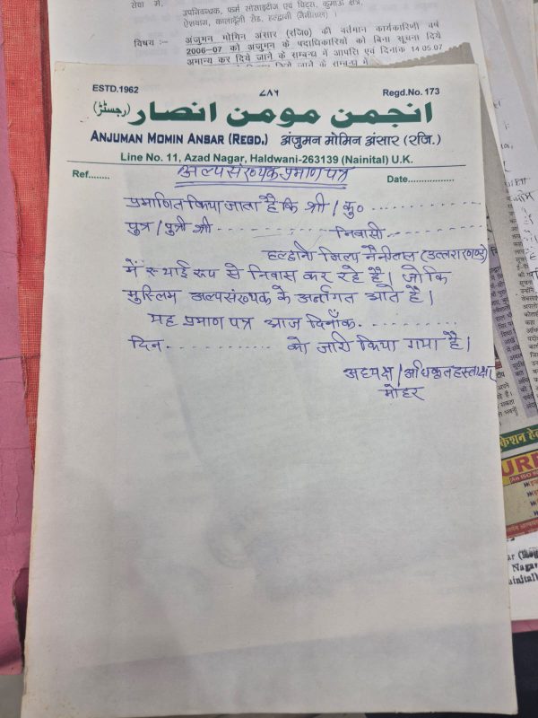 स्थाई प्रमाणपत्रों के सत्यापन अभियान के दौरान एक आवेदन में अंजुमन मोमिन अंसार, आज़ाद नगर, नैनीताल द्वारा जारी कथित “ प्रमाणपत्र” प्रस्तुत किया गया पाया गया।